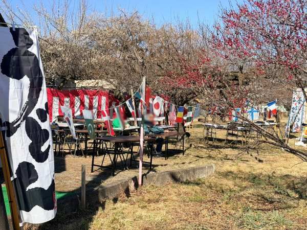 会場には出店も多く、ベンチで軽食を楽しみながらお花見ができます。梅の木の下で食べられるうどんもありました。