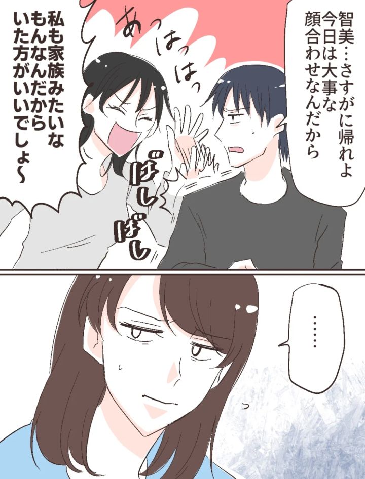 家族の会話にことごとく口を挟んでくる智美さんにうんざりしたのか、省吾は少し強い口調で「智美・・・さすがに帰れよ、今日は大事な顔合わせなんだから」と言いました。しかし、智美さんが素直に聞くはずありません。修吾の肩をバシバシと叩きながら、「私も家族みたいなもんなんだから、いた方がいいでしょ~」と冗談めかして笑います。私は、大切な結婚挨拶の日をなんだか智美さんに台無しにされている気がして、正直いい気分ではありませんでした。