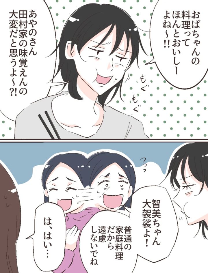 なぜか、夕食にも当たり前のように同席している智美さん。義母の料理をもぐもぐと頬張りながら、「おばちゃんの料理ってほんとおいしーよね」と言ったかと思えば、私の方を見て「あやのさん、田村家の味覚えんの大変だと思うよ~?」と上から目線でアドバイスをしてきました。義母は慌てて、「智美ちゃん大袈裟よ!普通の家庭料理だから遠慮しないでね」と彼女の発言を訂正します。