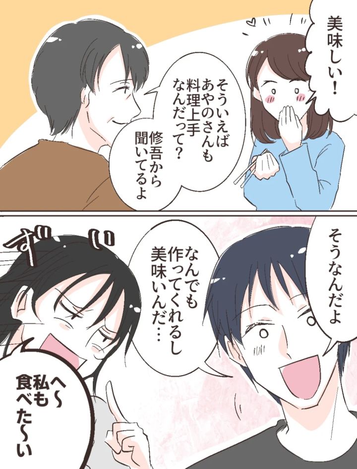 とはいえ、智美さんの言う通り、義母の手料理は本当に美味しい。私は夢中になって口に運びます。すると義父が思い出したように「そういえば、あやのさんも料理上手なんだって?修吾から聞いてるよ」と声をかけてくれました。それを聞いた修吾は嬉しそうに頷きながら、「なんでも作ってくれるし美味いんだ・・・」そう言いかけた瞬間、修吾の言葉にかぶせるように智美さんが「私も食べた~い」と口を挟んできました。