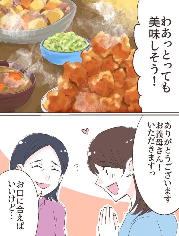 気を取り直して、夕食の時間。この日は、義母が私たちに気を遣って料理をご馳走してくれました。目の前に並ぶ美味しそうな料理の数々に、思わずテンションが上がります。私は胸の前で手を合わせると「ありがとうございます、お義母さん!いただきます」と大喜びで箸を取りました。