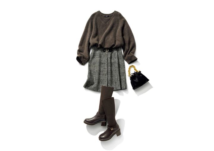 ニット¥31,900/ルーニィ ミニスカート¥17,600/ジャスグリッティー バッグ¥16,500/Kassiopea(ドレステリア 渋谷 スクランブルスクエア店) ブーツ¥17,930/RANDA