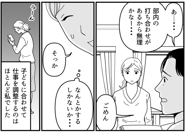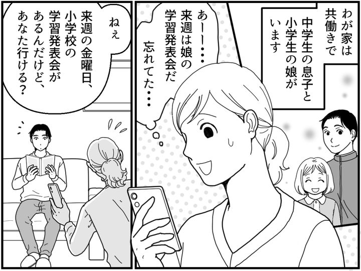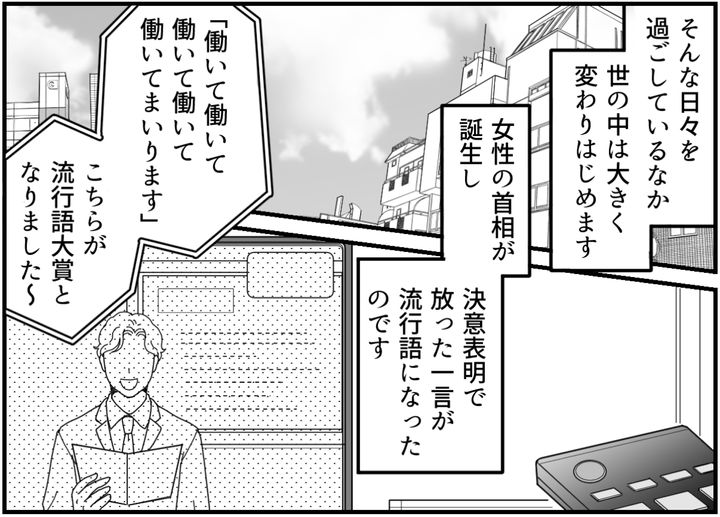 私(サキ)は、夫のタダユキと共働きをしています。中学生の息子と小学生の娘は学校行事や習い事などのスケジュールがそれぞれ異なり、把握するだけでもけっこう大変。必死で仕事を調整しながらなんとかギリギリでこなす毎日です。とはいっても、その調整の多くは夫ではなく私がしているのですが……。そんなとき世には女性の首相が誕生、流行語にもなったあの言葉が世間を賑わせます。その言葉を聞いた夫と私は、真逆の考え方を展開させるのでした。