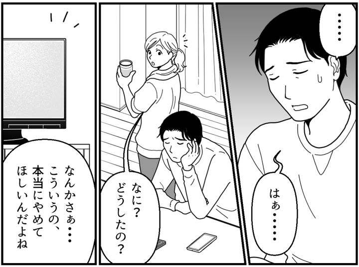 子どもに合わせて仕事を調整するのはだいたい私。夫には私がどうしても手が回らない部分を補ってもらっているという感じでした。そんなある日、夫はテレビから聞こえてきた言葉に「はぁ……」と大きなため息をついたのです。