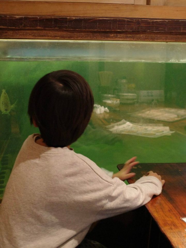 魚と見つめ合っているちなみに、私たちが通されたお席からは生け簀の中を泳ぐ魚が見えることもあり、お料理の待ち時間も退屈しませんでした✨