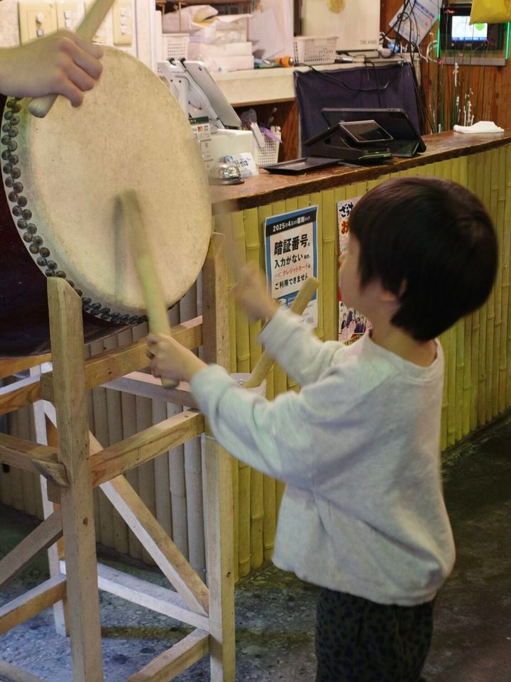 本物の太鼓を叩けるのも貴重な機会釣った魚は刺身・塩焼き・唐揚げなど好みの調理法を選べます。大きいお魚だと半身ずつ別の料理にすることもできました!ヒラメは息子のリクエストで刺身とお寿司になることが決定🍣