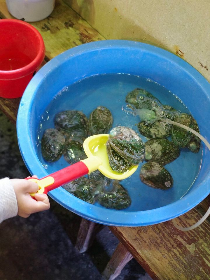 まだ釣竿が持てない赤ちゃんや小さなお子様も、貝なら一人で掬えるようになっていました!釣り針に餌をつけたり、魚を引き上げたりできなくても、「自分が捕まえた!」という喜びを味わえるって素晴らしい…🥺もちろん太鼓のセレモニー付きです✨
