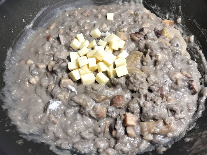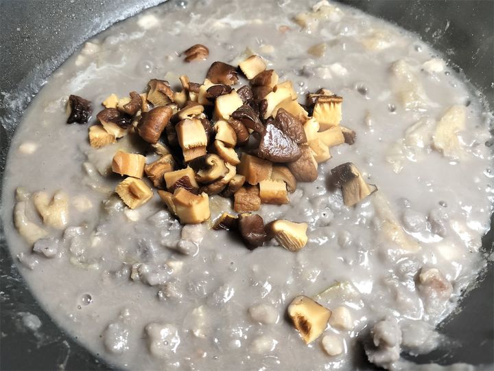 6. 田芋が柔らかくなったら、しいたけを加えてよく練ります。