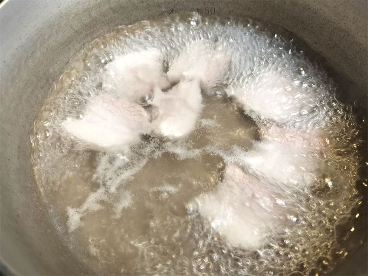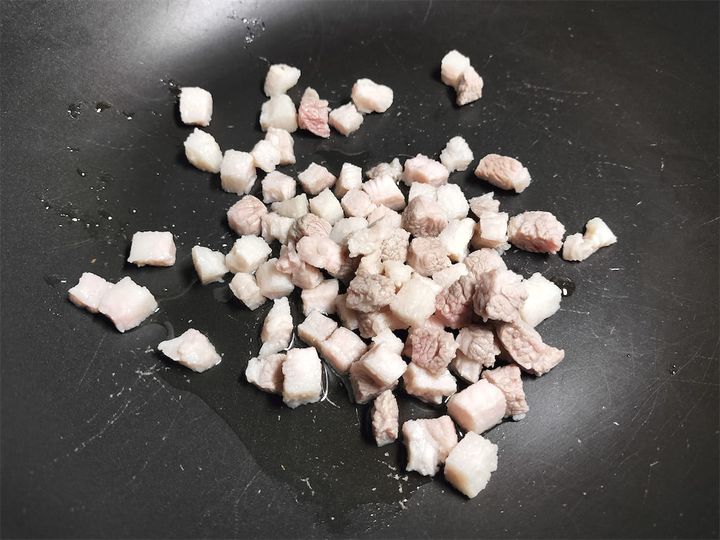 1. 鍋に豚肉と水を入れて中火で軽く茹で、5mm程度の角切りにします。茹で汁は残しておきます。