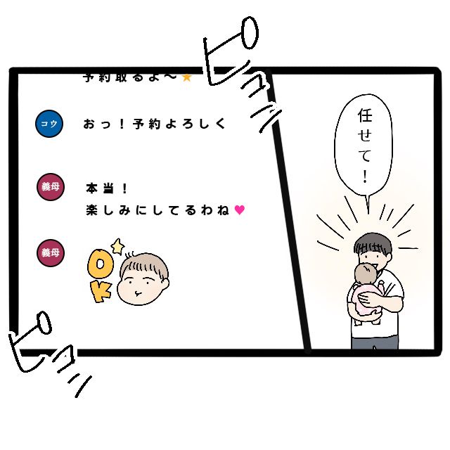 コウタは「任せて!」と自信満々に言うと、すぐに「予約よろしく」と義母に返信しました。コウタの返信を待ち構えていたのか、義母からすぐに「本当!楽しみにしてるわね」と返信がきました。