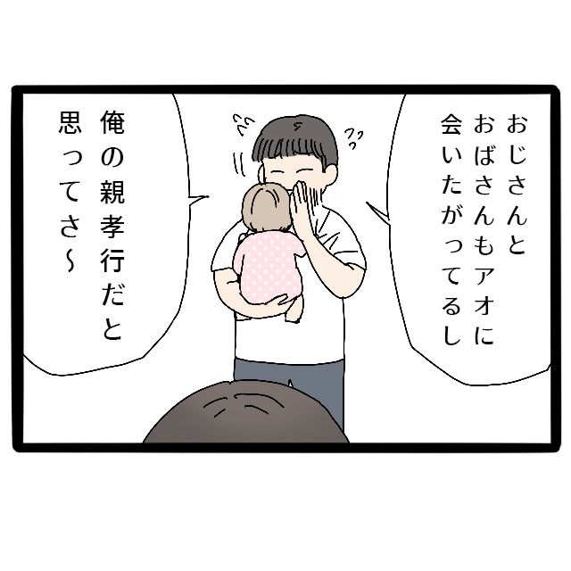 「親孝行」という言葉を口にしたコウタに「アンタの親孝行に私とアオって必要?」とモヤッとしましたが、もう話しが進んでしまっている以上断ることは難しそうだと感じ、「アオのこと優先させてよ?」と念押しして渋々了承しました。