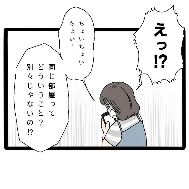 予想外の予約内容に、思わず「えっ!?」と大きな声が出てしまいました。「ちょいちょいちょい!同じ部屋ってどういうこと?別々じゃないの!?」アオとの初めての旅行でただでさえ不安いっぱいなのに、義両親と同じ部屋って・・。てっきり義両親とは別室だと思っていた私は愕然としました。いやいや、無理無理無理!旅行中はただでさえアオのことで気を張るだろうに、そのうえ義両親にまで気を遣って過ごすなんて・・考えただけでゾッとしました。