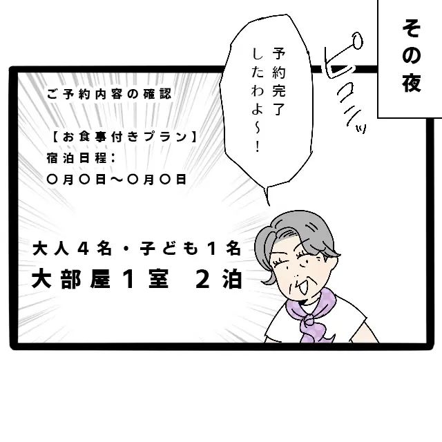 その夜。「予約完了したわよ~!」と義母からメッセージが届きました。添付された予約内容を見ると、大人4名、子ども1名で大部屋1室と書かれていました。