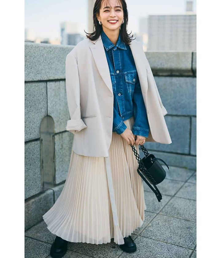真っ白が照れてしまう人は、ニュアンスカラーをチョイス。ボリュームたっぷりでドラマチック度が高い分、ともするとコンサバに転びがちな細プリーツ。ビッグジャケット&Gジャンでクール要素とこなれ感を意識して。裾にかけて緩やかに広がり、ほのかな透け感をもたらすリッチなオーガンジープリーツ。より揺れを強調するラップタイプ。