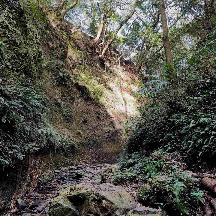 住宅街に出現する入り口から暗い洞窟を抜けると、シダ群落が一面を覆う幻想的な緑の世界が広がる。