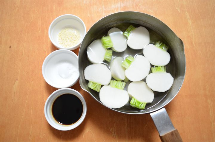 2. かぶを半分か1/4の大きさに切り鍋に入れ、[A]を加える。