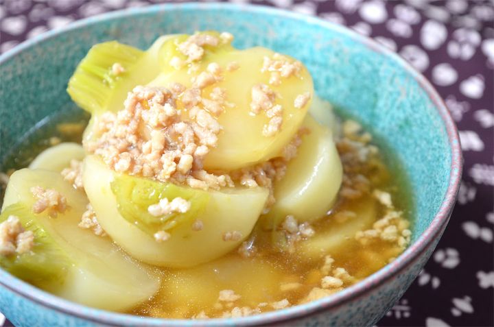 5. かぶが透き通ってきたら味を見て、薄かったら塩(分量外)を適量入れ、水でといた片栗粉でとろみをつける。器に盛り付けて完成。