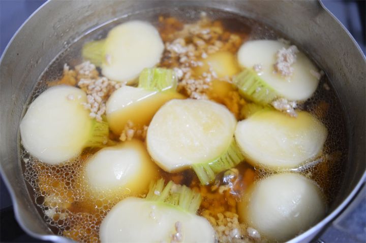 4. もう一度火をつけてアクを取り、かぶが柔らかくなるまで弱火から中火でコトコトと煮る。