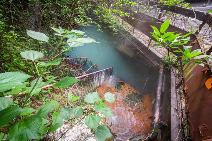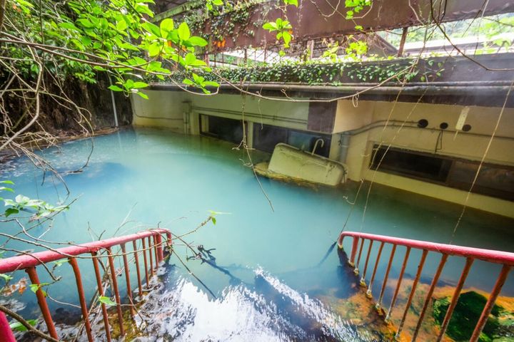 廃墟になった後もこんこんと温泉が湧き続ける旅館。温泉に飲みこまれた光景がなんとも幻想的!