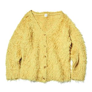 白に似た明るい色ながら、肌なじみのよい淡いイエロー。合わせやすさをさらに生かせる重ね着上手なルーズサイズのカーディガンで、何にでも気軽にひっかけられる。すっきり着られる深いVネック。高発色な色みを和らげながら、凝って見える華やかさをプラスしてくれるブランケットのような毛並みも魅力。