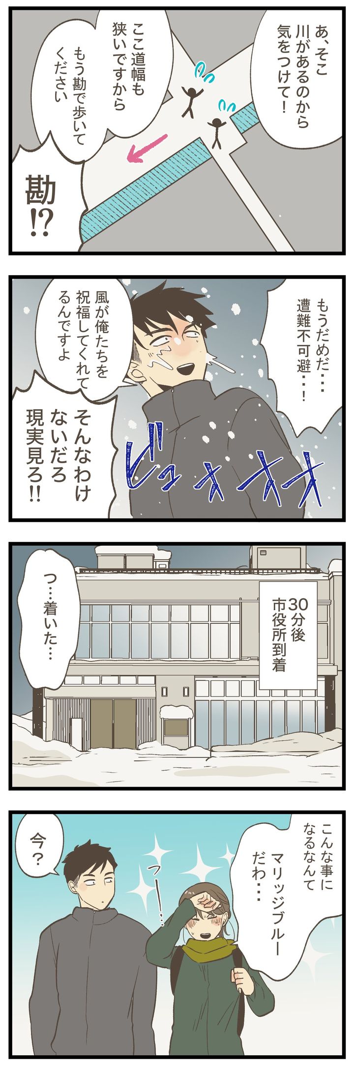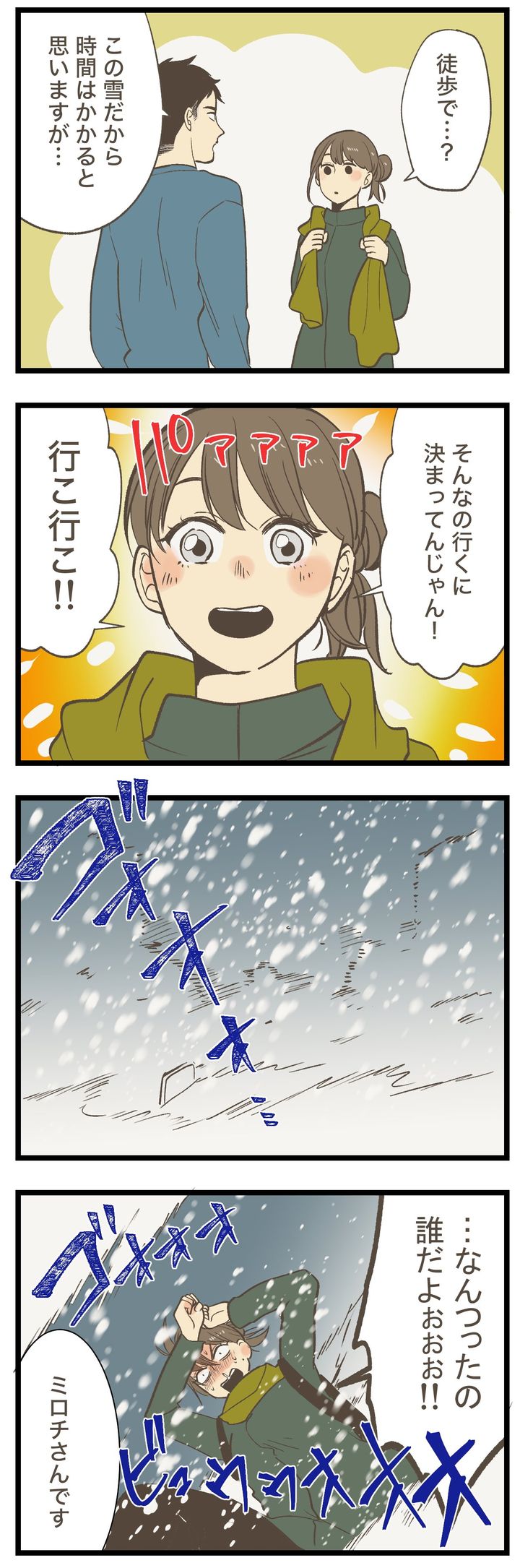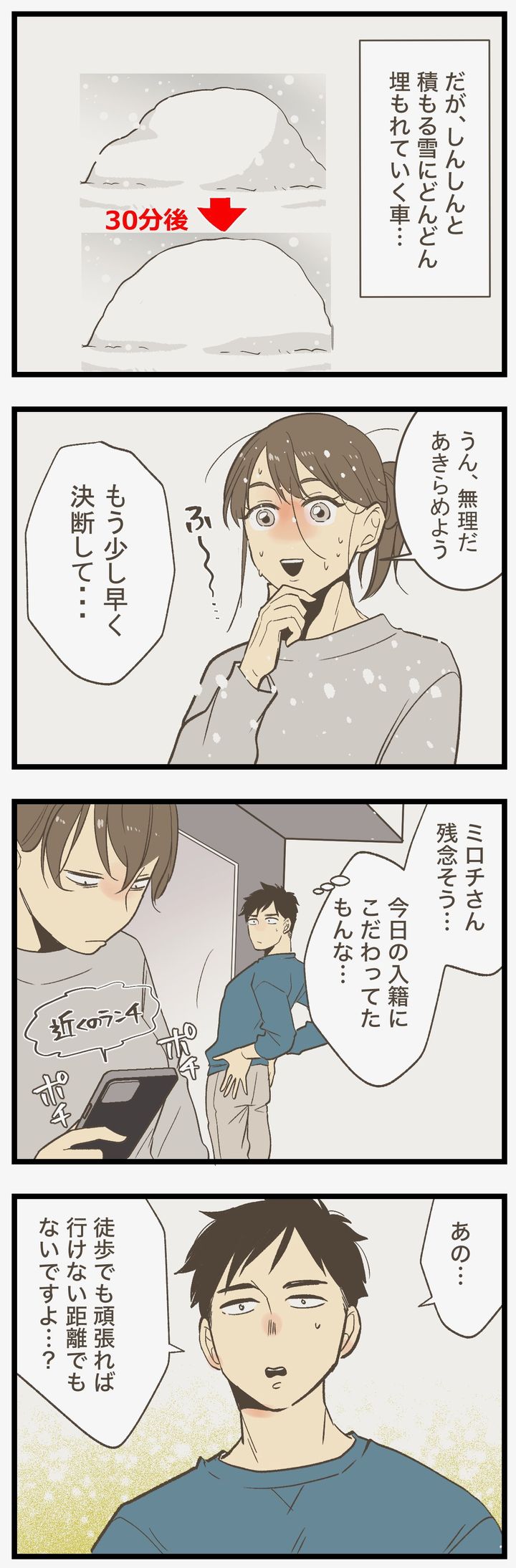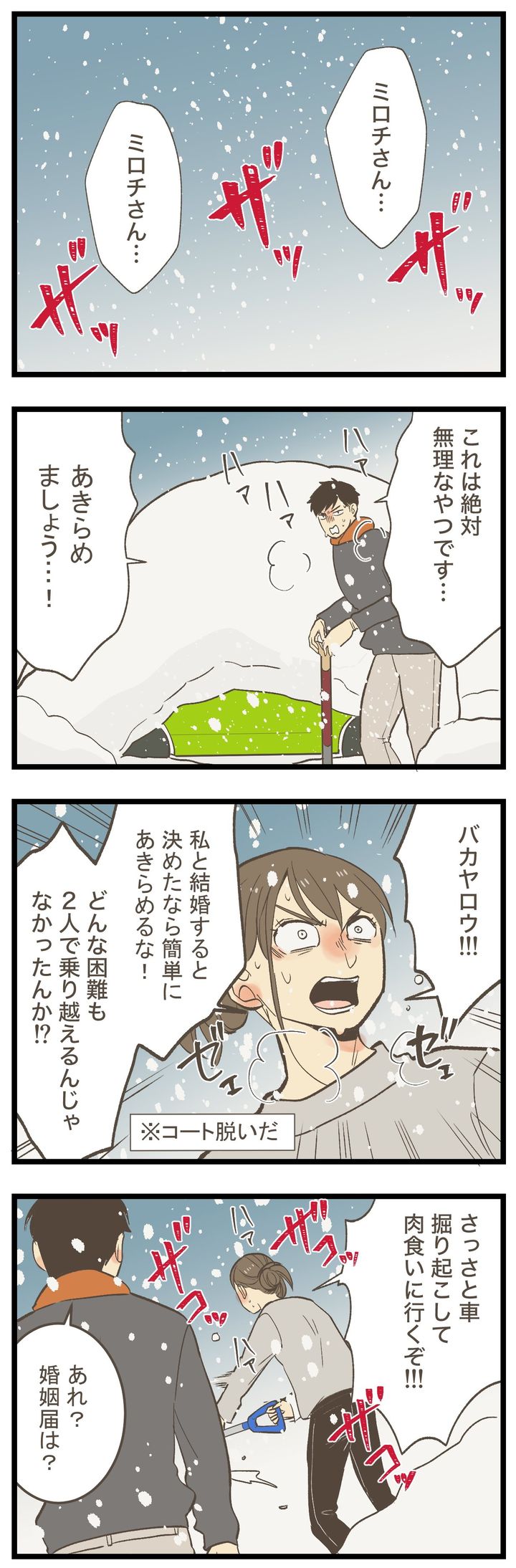 婚姻届の提出予定日は、なんと大雪!車で市役所に向かうつもりのふたりでしたが、車が埋もれてしまうほどの量…。「これは無理なやつです」と弱気のチロくんに、ミロチさんは「どんな困難もふたりで乗り越えるんじゃなかったのか!」と喝をいれます。