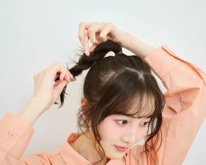 How to 2で結んだ毛束を2つに分け、それぞれ同じ方向にねじる。その2つの束をあわせて反対方向にねじっていく。ところどころ毛束を引き出したらゴムで結び、根元に巻きつけピンでとめる。