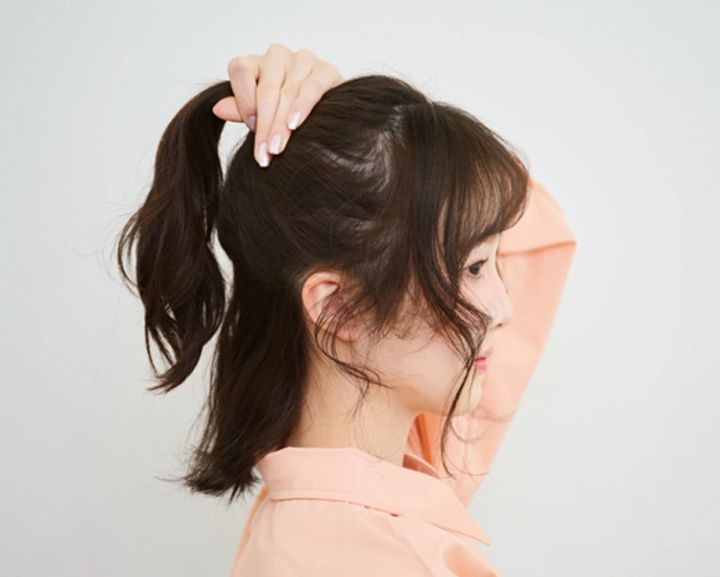 How to 2で結んだ髪は横によけておく。結べなかった髪は、えり足のおくれ毛を残してまとめ、束にしたらねじって上にあげてピンでとめる。