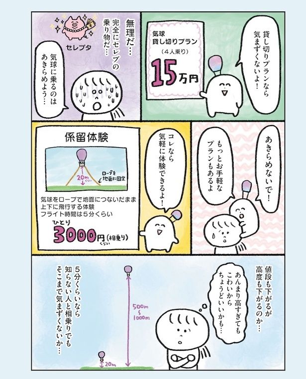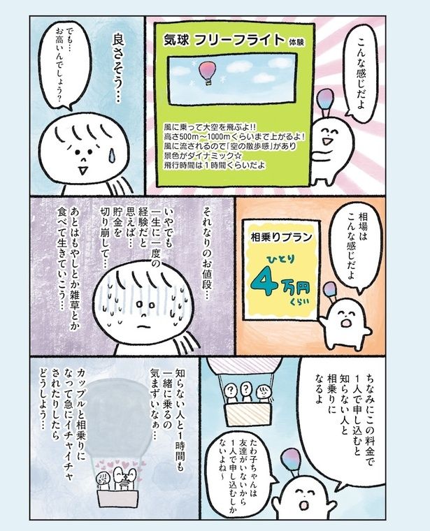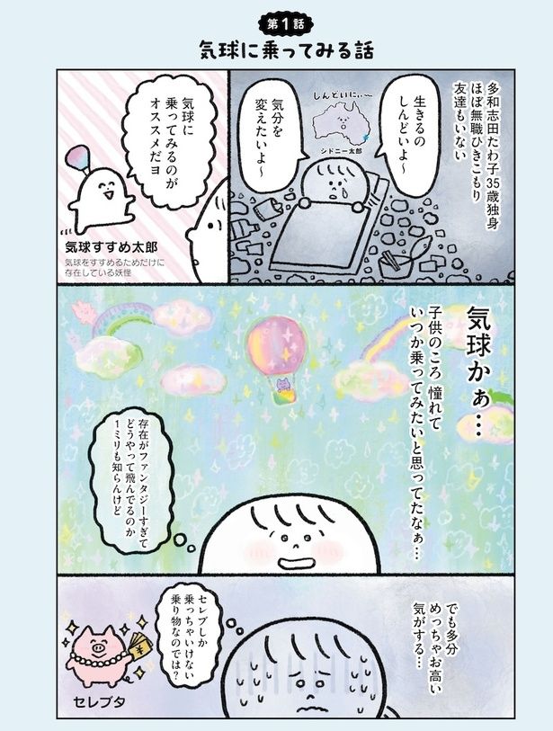 35歳、独身、ほぼ無職。友達も帰れる実家もなく、働く気力もない。何もしたくないし未来が見えない…。多和志田(たわしだ)たわ子は、漠然と「もう死にたい」という気持ちを抱えながらも、少しでも楽しく生きるために「幸せになれそうなこと」を片っ端からやってみることに。「気球に乗る」「ゴミ拾いボランティア」「競馬」など、さまざまなことに挑戦した彼女に見えてきたものとは――。
