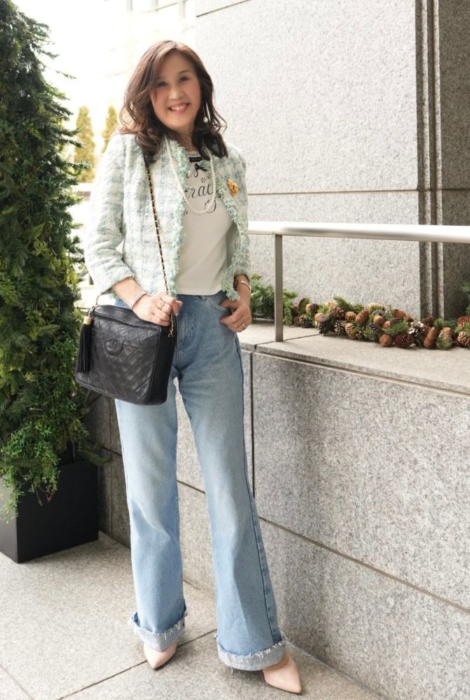 ツイードのパステルカラーとデニムの掛け合わせが春を感じさせる華やかな装いですね!デニムのストレートシルエットが綺麗でカジュアルながらもキリッと引き締まり、大人なコーデに着地しています。
