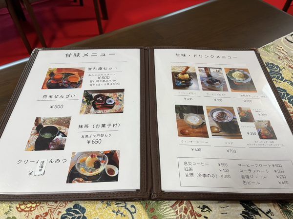 デザートも種類が豊富。人気は誉れ焼きとコーヒーが付いた「誉れ庵セット」(税込600円)。誉れ焼きはあんことカスタードの2種類から選べます。嬉しいことに1日と13日は、通常600円の「誉れ庵セット」が、550円になるそうです! お詣り帰りに誉れ焼き(単品150円)をテイクアウトする方も多いそうです。