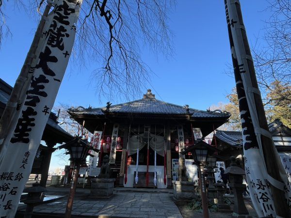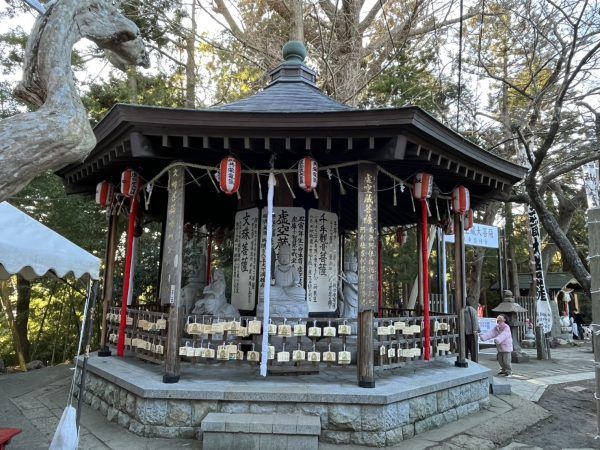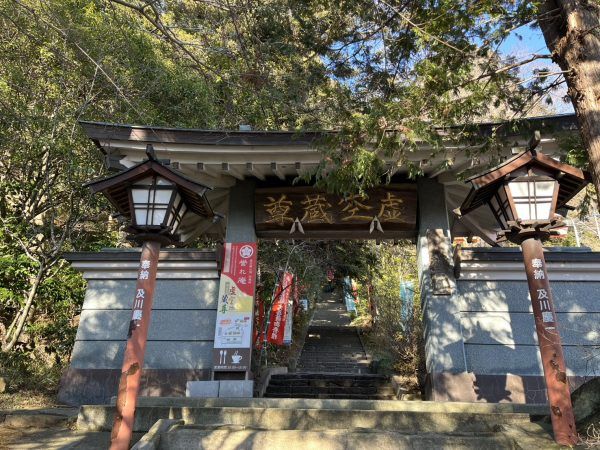 階段をのぼりきると到着です。※正面の看板は正月のみのものです。