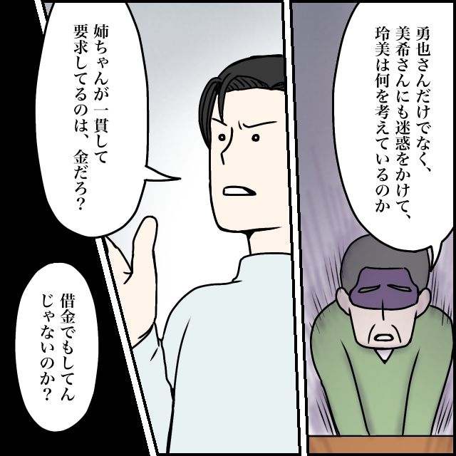 「勇也さんだけでなく美希さんにも迷惑をかけて、玲美は何を考えているのか」そう言い、ひどく落ち込んだ様子で肩を落とす義父。すると太一が「姉ちゃんが一貫して要求してるのは金だろ?借金でもしてんじゃないのか?」と口を開きました。