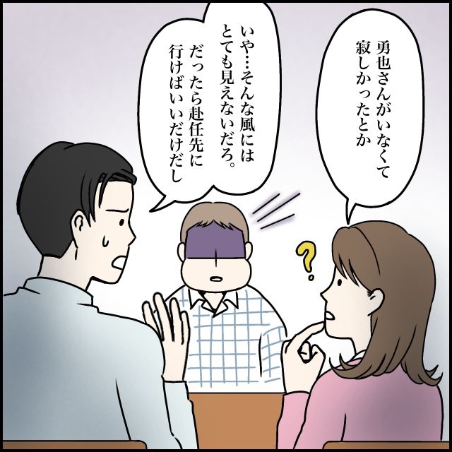 「勇也さんがいなくて寂しかったとか?」玲美さんが不倫を疑った理由をそう推測すると、太一はすぐに首を振りました。「いや、そんな風にはとても見えないだろ、だったら赴任先に行けばいいだけだし」その言葉を聞いて、私は「たしかに」と頷きます。