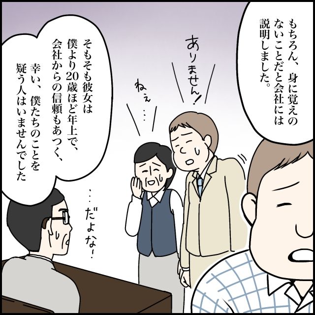 勇也さんによると、写真に写っていた女性は自分より20歳ほど年上のベテラン社員で、社内でも信頼の厚い存在。不倫はまったくの誤解で、身に覚えのないことだときちんと説明したところ、幸いにも2人の関係を疑う人はいなかったそうです。