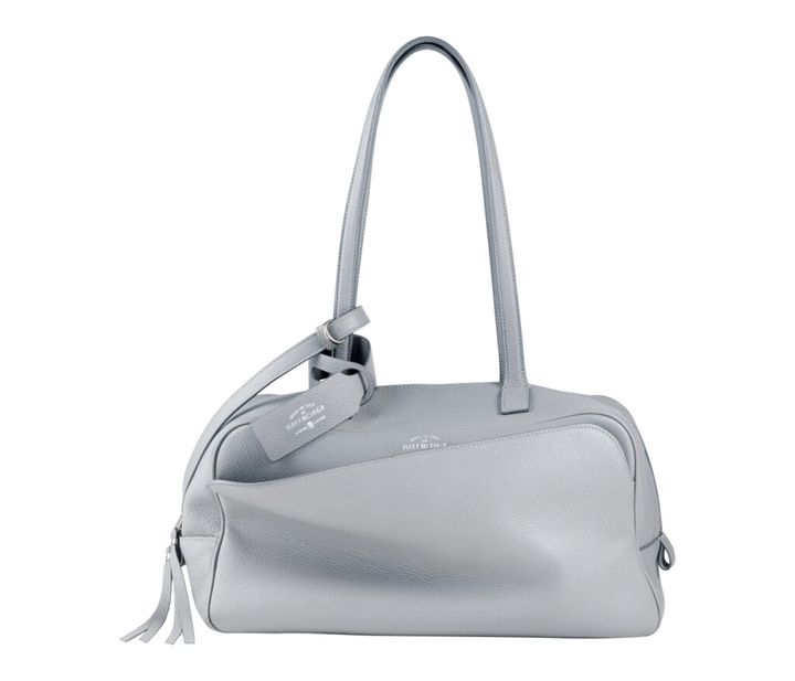 シボ感のあるカーフスキンをミニマルな横長フォルムに仕立てた、〈バレンシアガ〉の「キャリー ボウリングバッグ」。フロントポケットからはさりげなく刻印されたロゴが覗く。存在感のあるラゲージタグをアクセントにしたハンドルは、肩掛けも可能。写真のミディアムとスモールの2サイズがある。