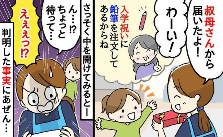 娘が小学校に入学する前の春休み、夫の叔母から入学祝いが届きました。小学生になることを楽しみにしていた娘がワクワクしながら中身を見てみると……。何かがおかしいことに気が付きました――。