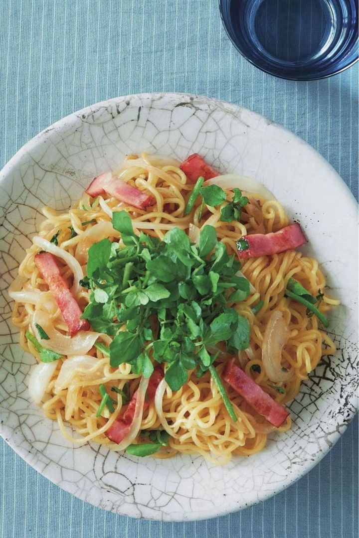 クレソンを使えば、いつもの焼きそばもぐっとおしゃれな一皿に。ナンプラーを絡めたもちもち食感の麺に、ベーコンのうま味と玉ねぎの甘さ、クレソンのほろ苦さが重なり、シンプルながら食べ進める手が止まらない。