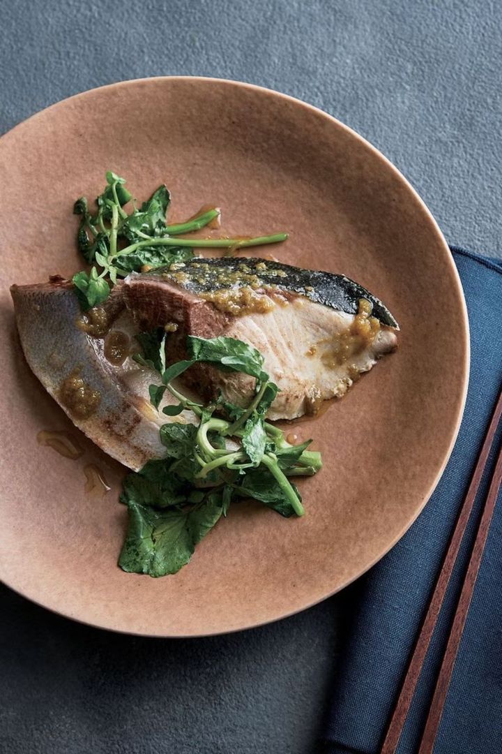 白ワインの香りをまとわせたぶりに鮮やかなグリーンのクレソンを添えて、春らしさを演出。クレソンのほどよい辛みが、脂ののったぶりのうま味をぐっと引き立てる。最後に柚子こしょうソースで爽快感ある後味に仕上げよう。