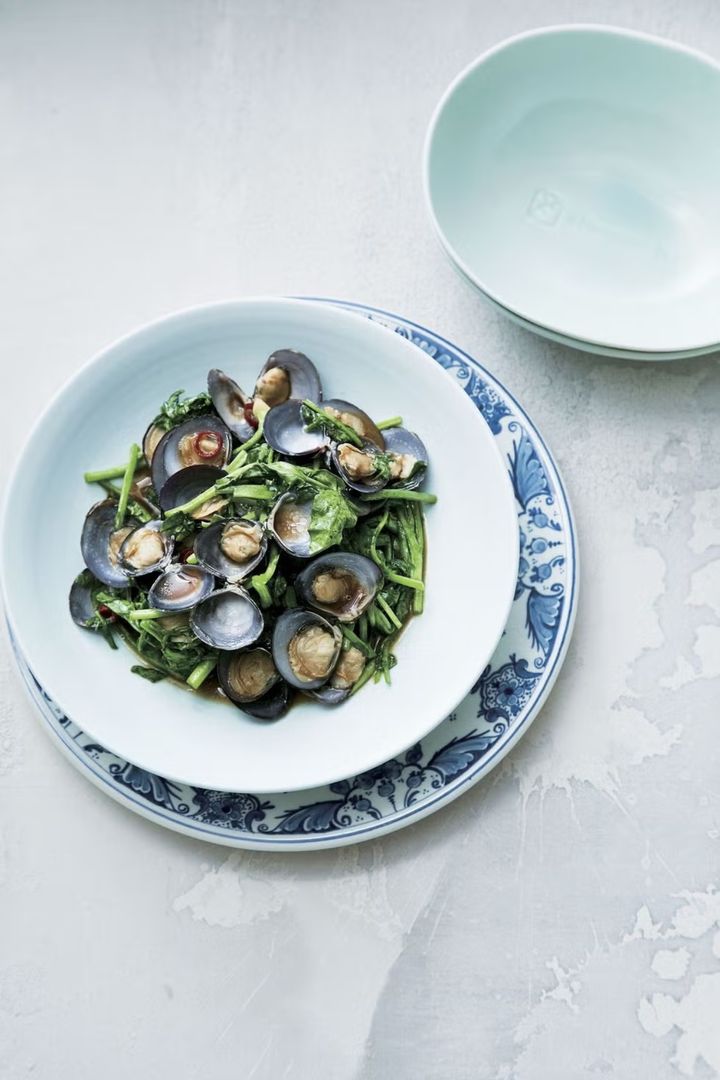 貝のうま味をぎゅっと閉じ込めた、お酒のアテにもぴったりな一皿。にんにくの香りをまとったしじみに、オイスターソースでコクとうま味をさらに重ねるのがポイント。ほろ苦いクレソンと濃いめに味付たしじみが互いを引き立て、クセになるおいしさに。