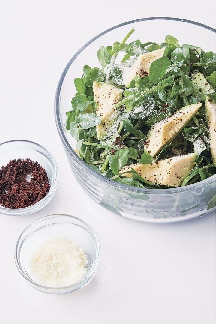 アボカドとクレソンをごま油であえたお手軽サラダ。食べる直前に黒七味とうま味たっぷりの粉チーズをふりかけることで、まったりとしたアボカドが奥行きのある味わいに。クレソンのピリッとした辛さがアクセント。