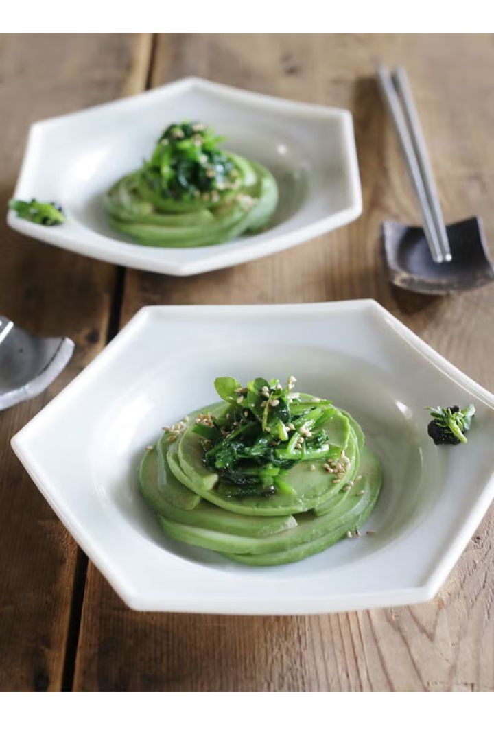 ごま油と岩のりの磯の香りをまとったクレソンを、アボカドの上にのせるだけ。食べる前に冷蔵庫で冷やせば、冷菜としても楽しめる。濃いめに味付けたクレソンとクリーミーなアボカドが口の中で溶け合うおいしさを堪能して。