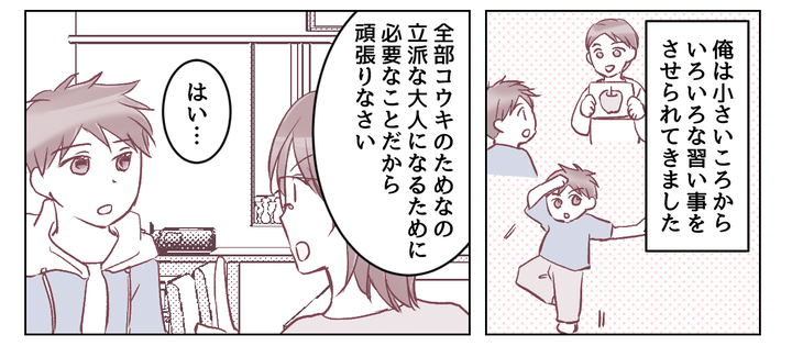 俺がしてきた習い事で、俺がやりたいと言い出したものはひとつもありません。全部「コウキのためだから」と言われて通いはじめたものばかり。行けと言われるから従うしかない。でもそこまで興味がないから必死になれないし、もっと頑張ろうという気にもなれないのです。