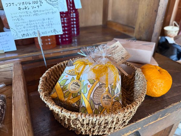 こちらは、ココナッツオイル100%のキッチンソープ。キッチン周りの掃除だけでなく、衣類の洗濯などにも使えるこのソープは、熱を加えずに時間をかけて自然に熟成させる製法で作られているんだそう。