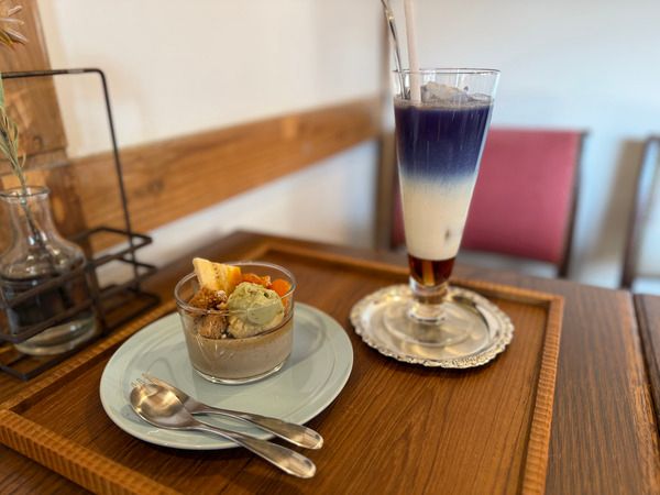 デザートは、グルテンフリーの「大人のプリンサンデー」。美しい色の「ブルームーンティーラテ」と一緒にいただきます。