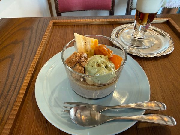 サンデーはココナツミルクプリンに、安納芋のアイス、ピスタチオクリーム、金柑、バナナ、そしてザクザク食感の綱五郎クッキーのトッピング。トッピングは季節によって旬の物を使われているそうですよ。