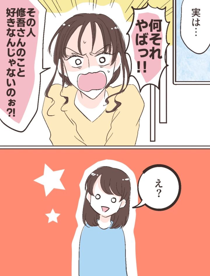 「実は・・」と義実家での出来事を話すと、「何それやばっ!!その人、修吾さんのこと好きなんじゃないのぉ?!」とふみのの顔色が変わりました。そんな発想のなかった私は、ふみのの言葉に「え?」と目が点。