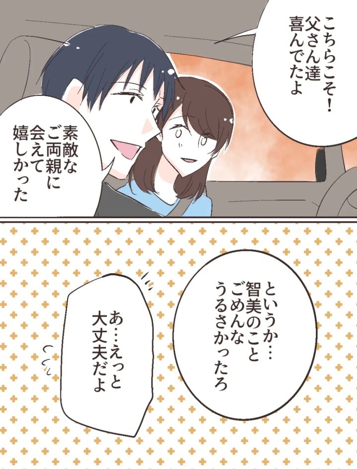 結婚の挨拶も無事に終わり、義実家をあとにした私たち。優しく迎えてくれたご両親にホッとしつつも、どうしても智美さんの存在が気になりました。兄妹のように育ったとはいえ、婚約者の私の前で修吾とじゃれ合う智美さんにはどうしてもモヤモヤしてしまいます。でも、大切な日を嫌な気持ちのまま終わらせたくなくて「修吾、今日はありがとうね」と気持ちを切り替えて伝えました。