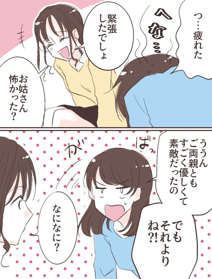 「つ・・疲れた」とソファに倒れ込む私を見て「緊張したでしょ。お姑さん怖かった?」と冗談っぽく笑うふみの。その言葉に、私はがばっと体を起こして「ううん。ご両親ともすごく優しくて素敵だったの。でも、それよりね?!」と切り出しました。ふみのは「なになに?」と興味津々。