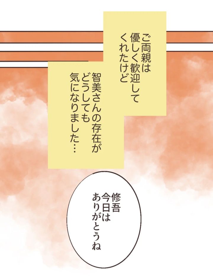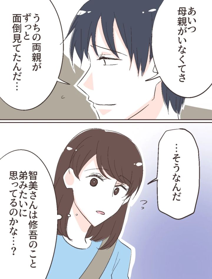 すると「あいつ母親がいなくてさ。うちの両親がずっと面倒見てたんだ・・」としんみり話しだした修吾。私は「・・そうなんだ」と返しつつ「智美さんは修吾のこと弟みたいに思ってるのかな・・?」と智美さんの修吾への態度にも納得しようとしました。