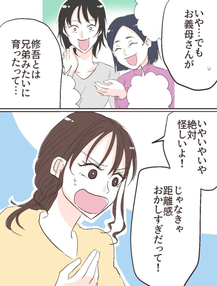 「いや・・でもお義母さんが修吾とは兄弟みたいに育ったって・・」と修吾と智美さんの関係性を説明するも、「いやいやいや、絶対怪しいよ!じゃなきゃ距離感おかしすぎだって!」とふみのに反論されました。